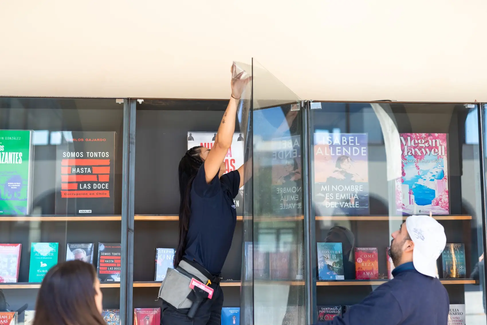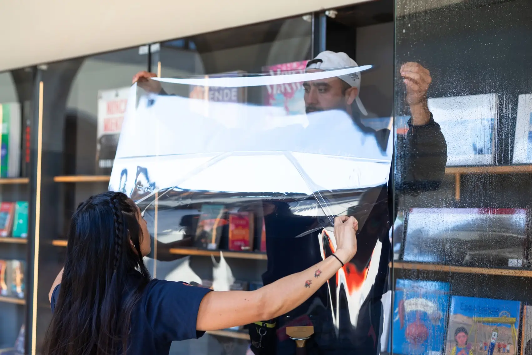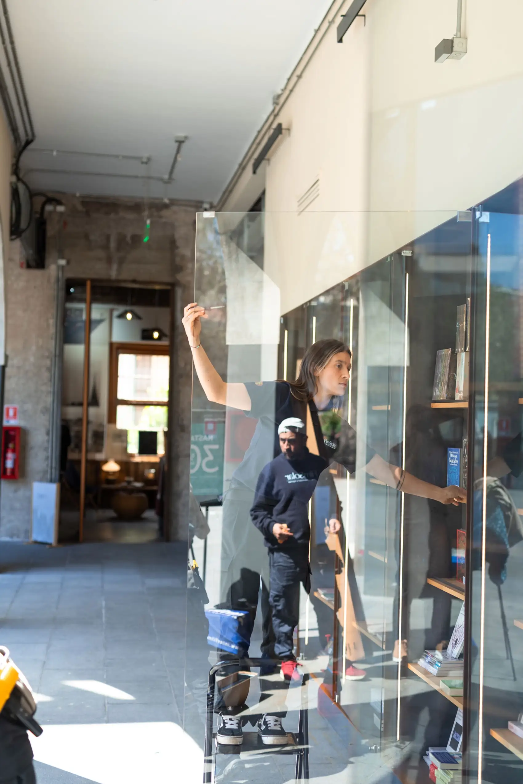La instalación se realizó en horario diurno, coordinando el trabajo para no afectar la operación normal de la librería. El equipo trabajó sobre ventanales de gran formato, cortando y aplicando cada lámina PureLite 60 a medida. El proceso se ejecutó con especial cuidado, manteniendo el orden y la limpieza del espacio, y asegurando una terminación prolija que se integra de forma natural al diseño del nuevo local.