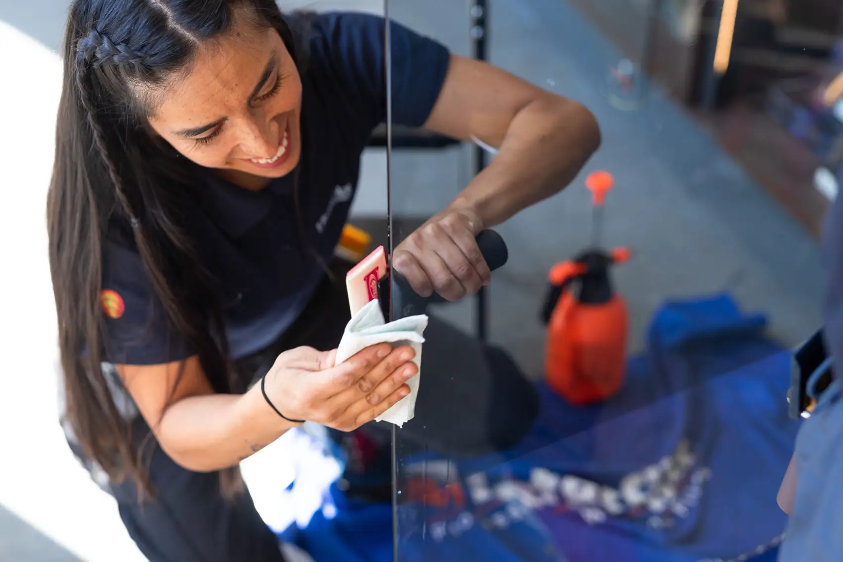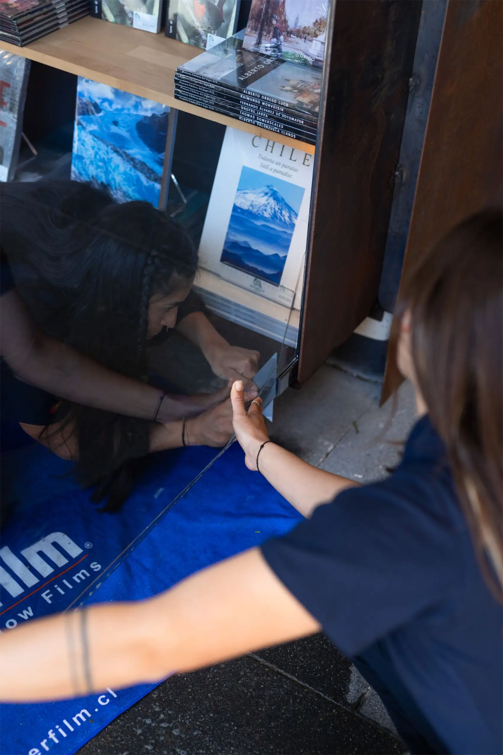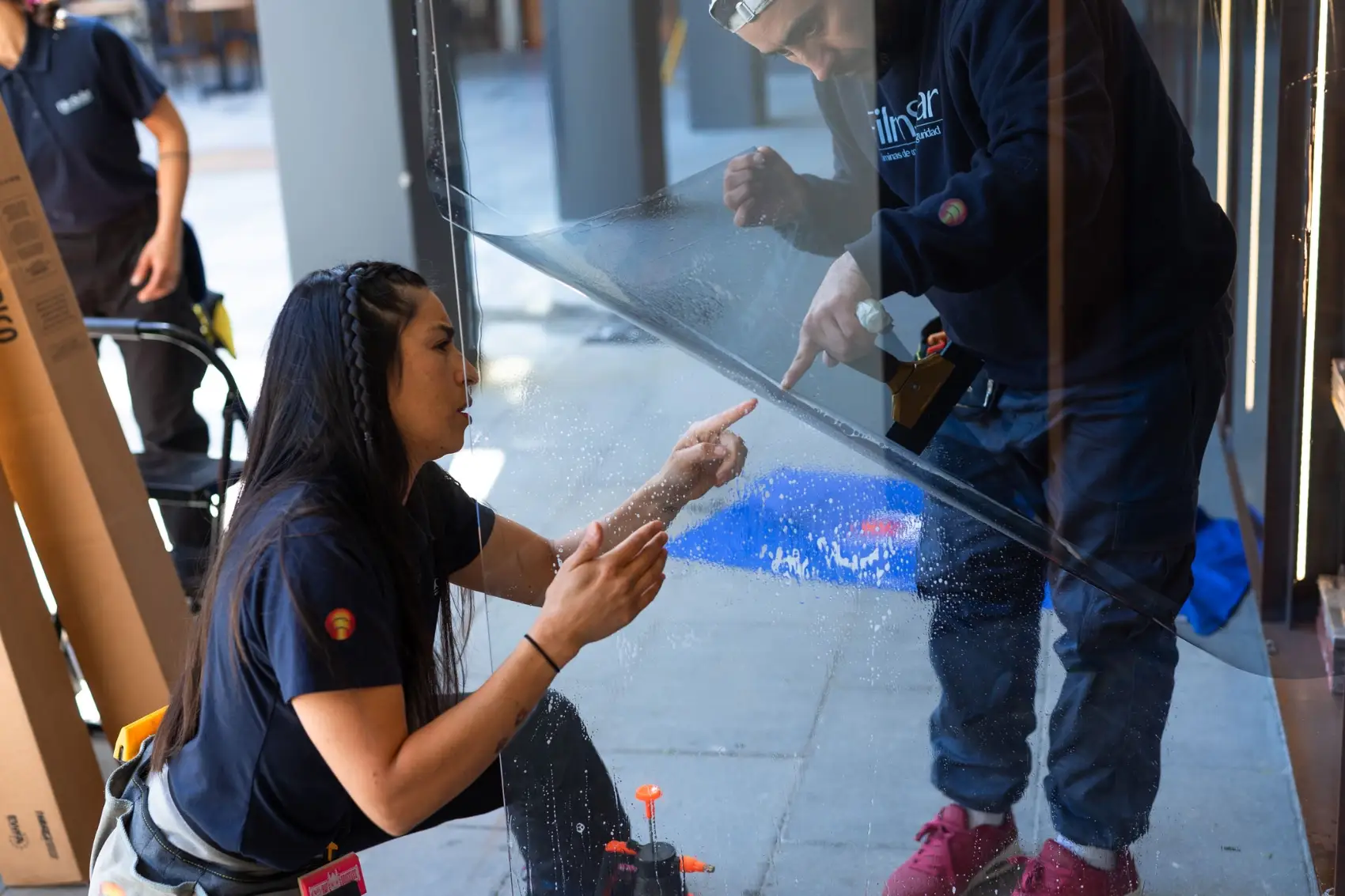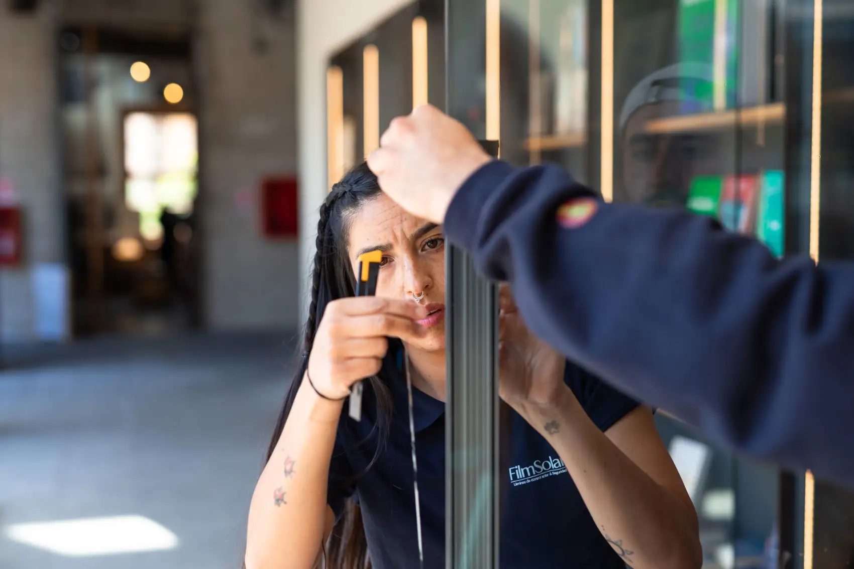 La instalación se realizó en horario diurno, coordinando el trabajo para no afectar la operación normal de la librería. El equipo trabajó sobre ventanales de gran formato, cortando y aplicando cada lámina PureLite 60 a medida. El proceso se ejecutó con especial cuidado, manteniendo el orden y la limpieza del espacio, y asegurando una terminación prolija que se integra de forma natural al diseño del nuevo local.